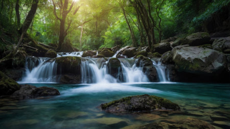 AI Generated. Water cascading down rocky cliffs creating a silky smooth waterfall