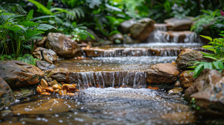 Water flows gracefully over rocks, forming small waterfalls in a peaceful natural environment.