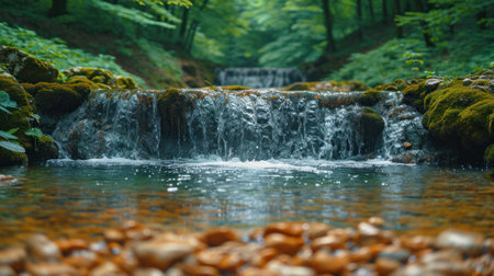 A serene waterfall cascades over textured stones, creating gentle ripples in the clear water. Surrounded by lush greenery, this tranquil scene invites relaxation and reflection.