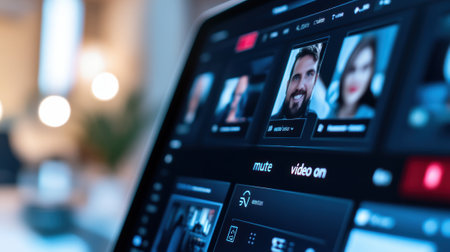 Clean workspace with laptop showing virtual meeting controls like mute, record, and share screen