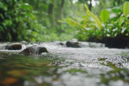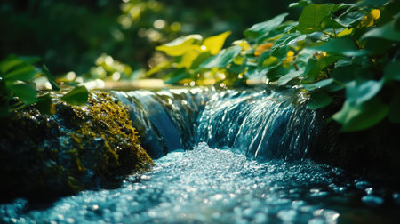 A tranquil stream flows gently over moss-covered rocks, creating a serene and refreshing atmosphere. The sparkling water reflects sunlight, highlighting nature's beauty.