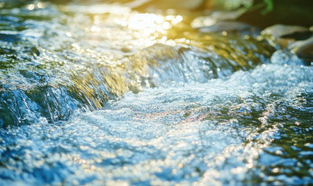 Close-up of clear water flowing gently over smooth stones in a serene stream, with sunlight glistening on the surface