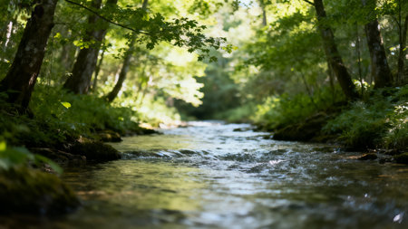 Gentle stream cascades through a sun-drenched forest, creating a tranquil scene. Rocks peek out from the flowing water, reflecting the surrounding verdant landscape.