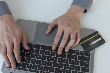 The businesswomen's hand is holding a credit card and using a laptop for online shopping and internet payment.