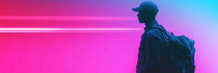 In a colorful atmosphere, a delivery worker in silhouette moves confidently, set against a gradient of neon shades creating an energetic vibe at dusk.