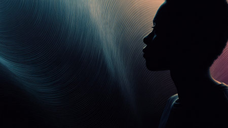 A silhouette of a speaker stands in low light with wave lines suggesting audio movement and energy in an evening atmosphere.