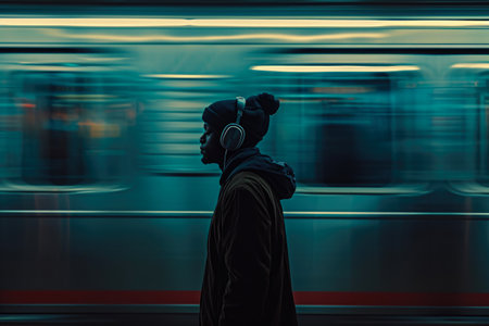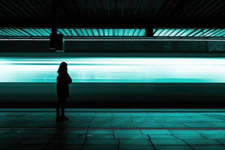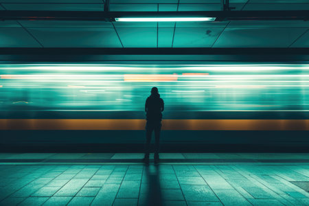 Long exposure image of a lonely young man shot from behind in a subway station with a blurred train