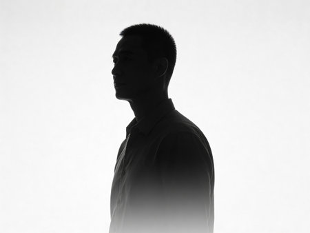 A vertical shot of a male's silhouette standing in front of a grey wall
