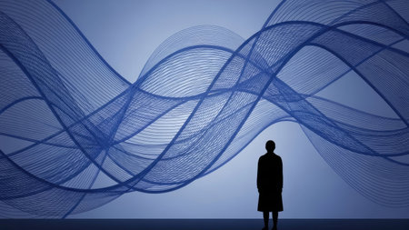 A single speaker silhouette stands against a background with subtle wave lines, creating a striking visual experience during an event.