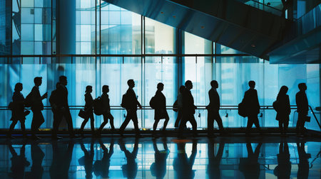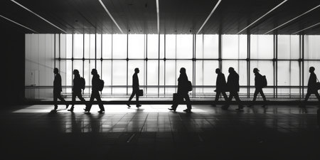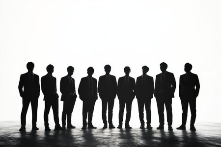 A crowd of people is silhouetted against a bright, undefined background. The image presents high contrast with dark figures and a stark white space. The composition emphasizes shadows and form, suggesting potential for use in a variety of visual concepts and artistic projects. Suitable for editorial and commercial applications.
