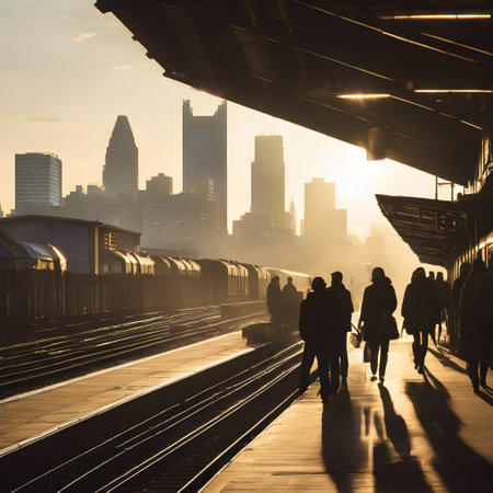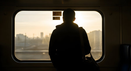 The silhouette of a traveler stands by a train window, gazing out at the passing urban landscape bathed in the golden light of sunset. The scene captures the feeling of transit, reflection, and the journey home or to a new destination.