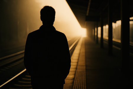 Silhouette of a man on an empty platform in foggy light. Space for text