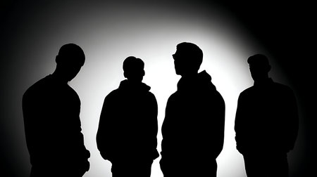 The silhouettes of four people stand in a huddle postures tense and ready for action. .
