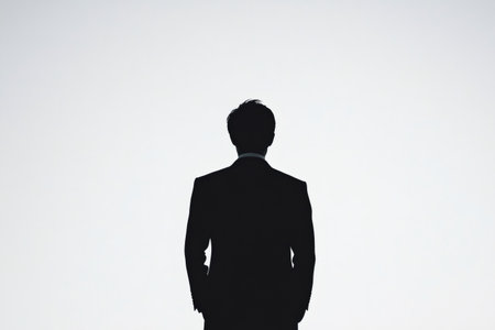 Silhouette of a businessman standing with hands in pockets, rear view, minimalist concept on white background