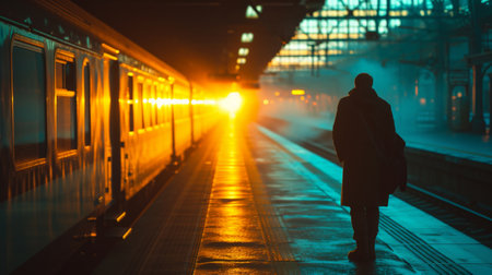 A striking silhouette of a man stands against a backdrop of radiant train tracks. The vibrant colors blend seamlessly into a high-speed locomotive, evoking motion and energy.