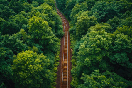 This captivating aerial image showcases a long railway track winding through a dense forest, highlighting the harmony between human infrastructure and untouched nature.