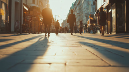 A busy city street with people walking and a few cars. The sun is setting and casting shadows on the ground. AI generated.