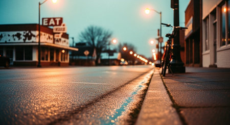 This image captures a roadside perspective of a city at dusk. The foreground reveals a textured road surface with water reflecting the colorful sunset. Bokeh lights from city buildings create a blurred background. Suitable for various commercial and editorial applications.