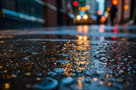 Raindrops on a wet street in New York City, USA.