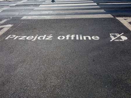 Poznan, Poland - August 09, 2021. Crosswalk with warning cross the road offline - Przejdz Offline