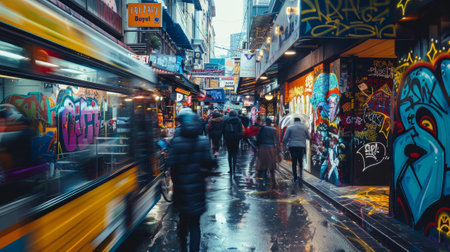 A busy city street with a bus and graffiti on the walls. The people walking down the street are wearing coats and hats, and the rain is falling. Scene is lively and bustling