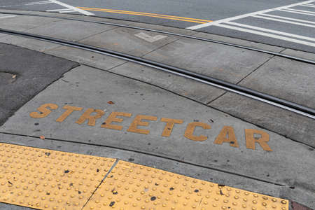 Asphalt and concrete street surface with metal streetcar rails, yellow streetcar sign and handicap ramp, horizontal aspect