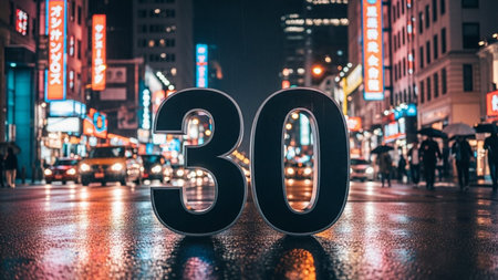 The number 30 is illuminated at night in downtown Los Angeles.