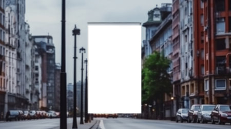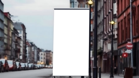 A mockup of a blank white polyester banner hanging from the top of a lamppos. Generative AI
