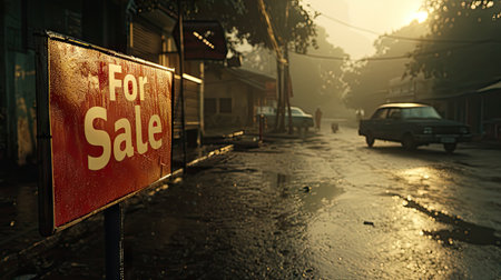 In the midst of the street, a for sale sign is prominently displayed, drawing attention to potential buyers passing by.