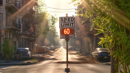 Sunlit street with a glowing speed limit sign at dawn, creating a serene urban scene.