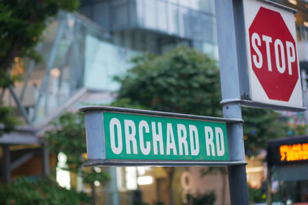 Street sign of Orchard Road in a bustling urban area