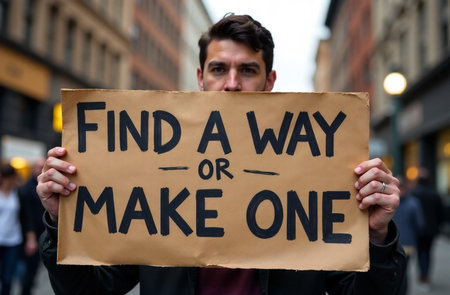 Young man holding a placard with the text Find a way to make one