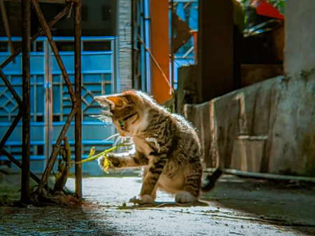 domestic cat play in the outside at street at city