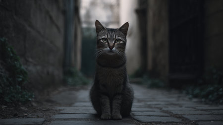 This captivating image features a grey cat sitting calmly in a narrow cobblestone alley, showcasing its curious gaze and urban surroundings.