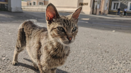 A cute stray tabby cat, standing on the pavement with a frightened expression. Animal welfare and the struggles faced by stray animals in urban environments.