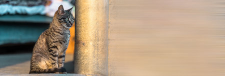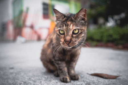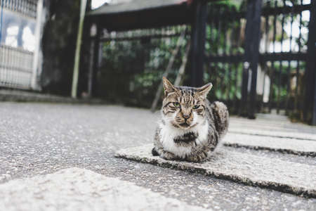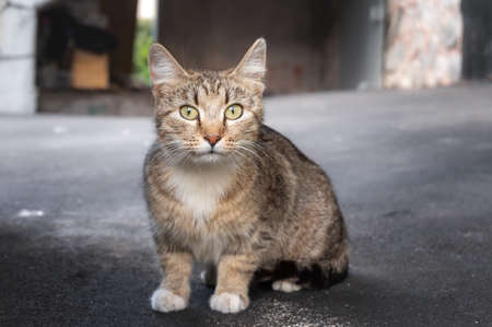cute striped cat sitting on the street on blurred background