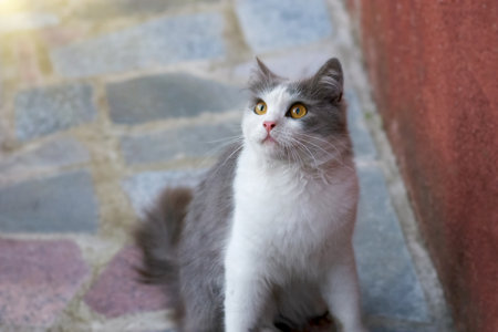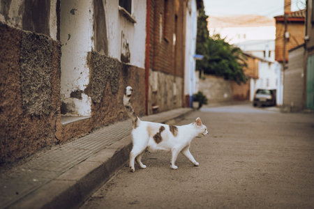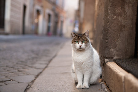 Portrait of a street cat standing and looking in old european city, animal natural background