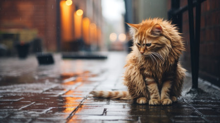 Sad homeless cat sitting on the street during the rain. High quality photo