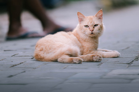 cute street cat rest on stone platform