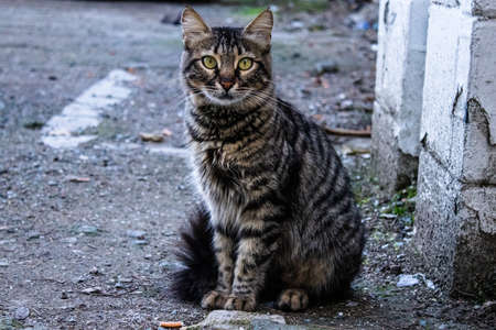 view on striped mongrel cat sitting on the street