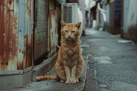 Exploring Urban Freedom: An Agile Alley Cat with a Motley Coat and Bright Eyes. Concept Urban Exploration, Agile Cat, Alleyways, Motley Coat, Bright Eyes