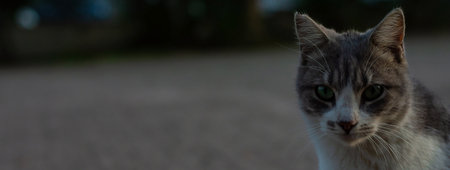 Portrait of cute cat with focus on eyes of gray orange and black colors posing and looks at the camera on the ground on the evening time. Pet outdoor close up concept with copy space