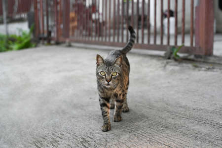Gray cat with tiger stripes walking on the sidewalk at sunny day.