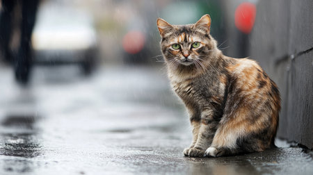 A captivating image of a stray cat sitting alone on a rainy street, showcasing its beautiful fur and expressive eyes, amidst an urban backdrop and puddles.