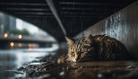 An AI-generated illustration of a homeless cat huddled under a bridge during rain.