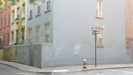 New York City oneway crossroad, Minetta street intersection one way arrow road sign. Manhattan Greenwich Village residential building architecture, NYC, United States. Blue brick wall, fire hydrant.