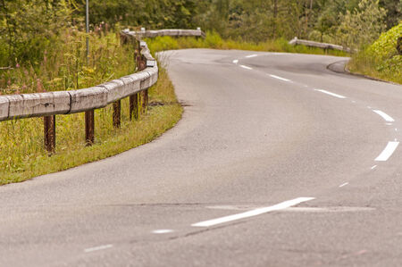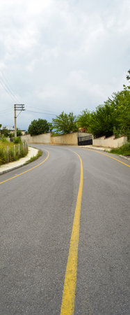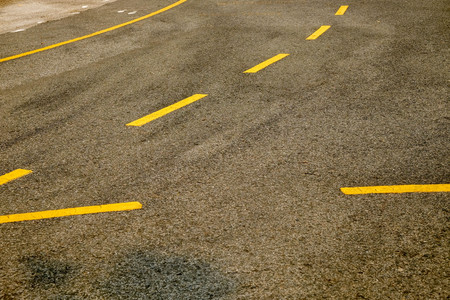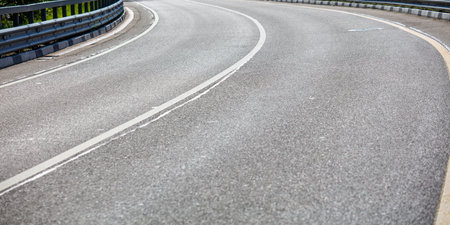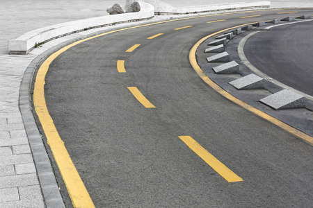 Curving asphalt road with yellow lines close up, serpentine way, abstract