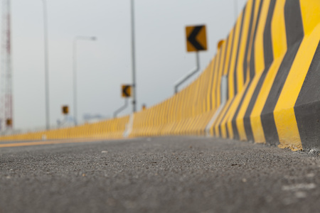 Close up asphalt road with red color warning sign on road protection with sun light in morning time