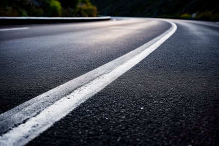 Smooth asphalt stretches ahead, highlighted by bold white markings. A fresh tire impression adds a touch of action, capturing the essence of movement along this winding route.
