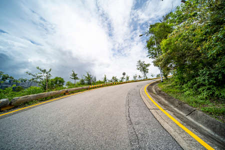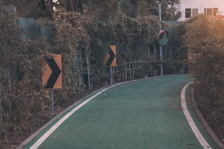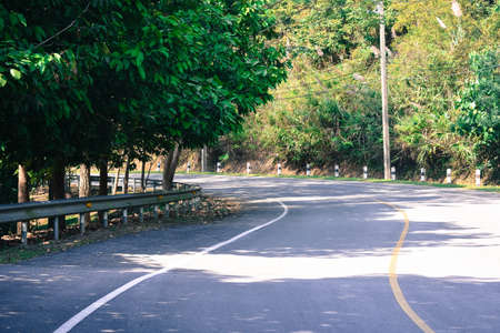 Asphalt road with curve road sign. nature and wildlife views in the middle of the jungle in Thailand National Park.